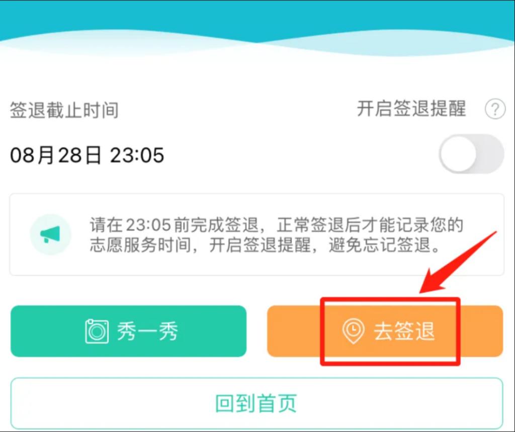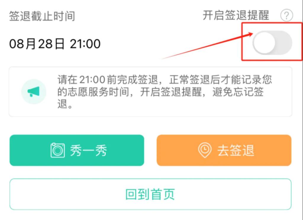志愿者如果没有在活动规定时间或规定活动范围内签退志愿服务时长,将无法计入信用时长。因此,为了避免“忘记签退”的发生,大家可以在签退页面点击开启【签退提醒】,并选择【提醒时间】即可。